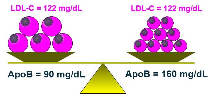 The pathophysiology is beyond our scope, but the core message is that arterial injury is caused by the number of LDL particles, not the amount of cholesterol inside them. Think of a traffic jam: it depends on how many cars are on the road, not how many people are in each car. Yes, they are correlated, but they are not the same. Size modulates risk, but number drives it. This is why LDL-C can look “good” while LDL particle burden and risk actually are high. Since each LDL particle contains one apoB on its surface, the apoB concentration essentially is the LDL particle concentration.