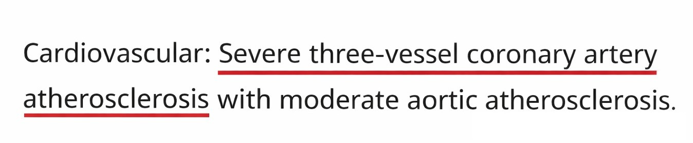 Three words do most of the work here: “severe,” “three-vessel,” and “atherosclerosis.” Each implies established, clinically significant disease. Although none of them, alone or together, establishes meaningful CVD risk without context, in practice they function as a diagnosis and drive what comes next.